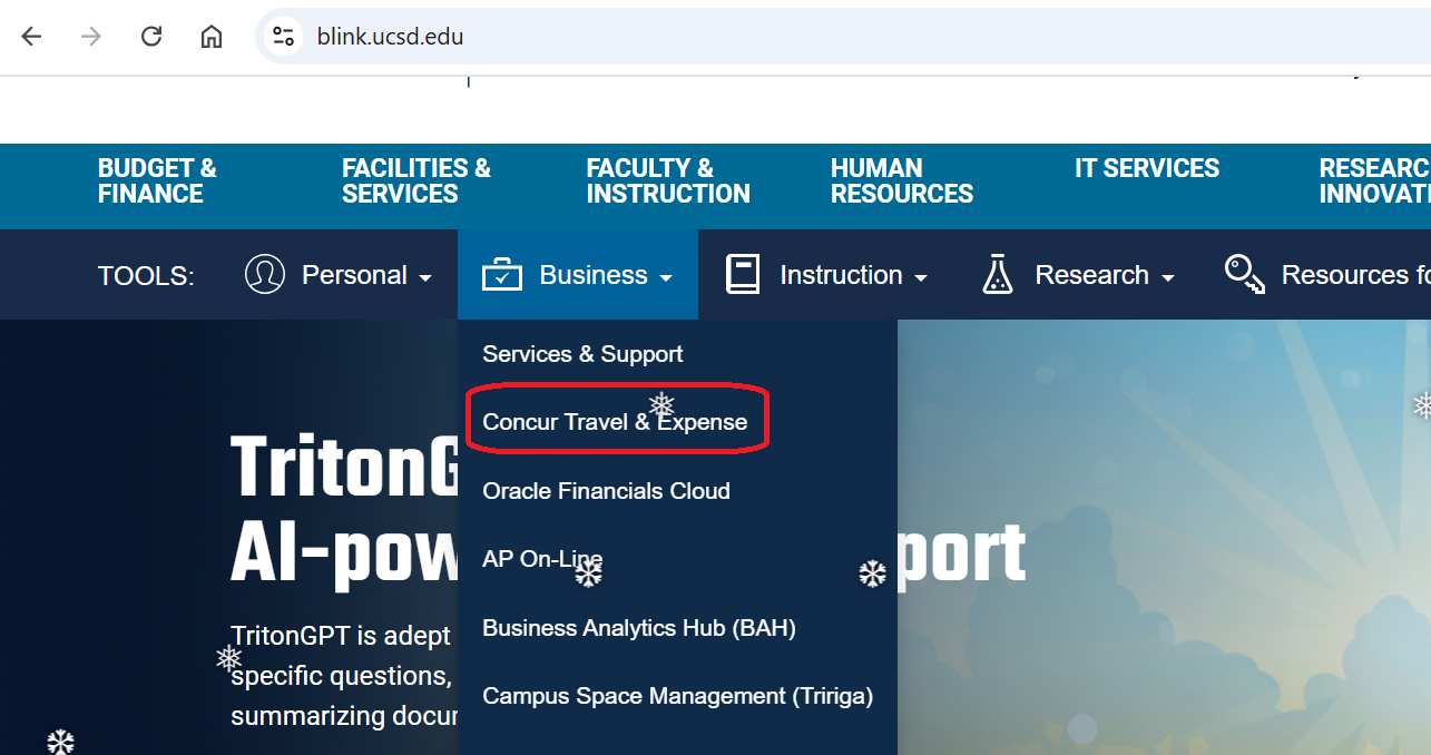 1. To login, you can go to Blink (blink.ucsd.edu) and then select Concur Travel & Expense from the Business dropdown OR type in concur.ucsd.edu into your browser.