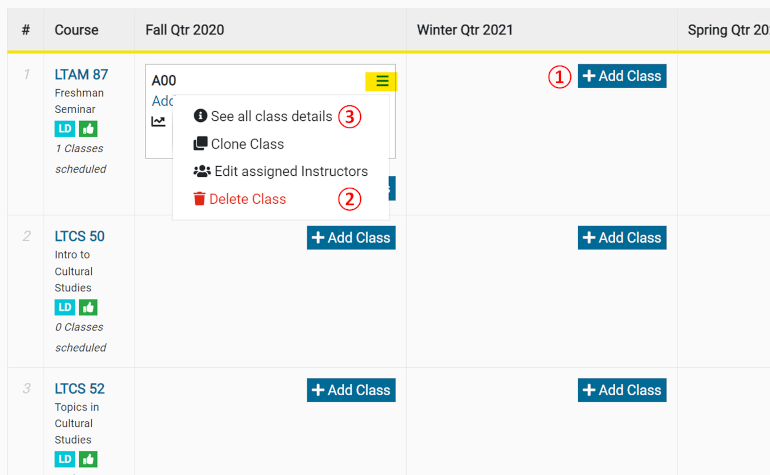 - Removing a course (② below, which appears after clicking on the highlighted menu button)