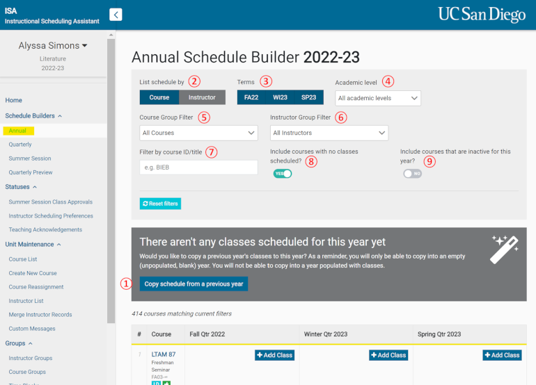 - Only courses that are currently on the annual schedule build versus all courses (⑧ above)