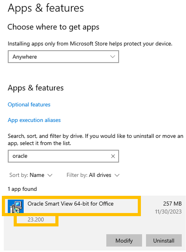 e. Navigate back to Apps & Features (as in step 1a of the Verify Smart View Version section), search for Oracle Smart View 64-bit for Office, select Uninstall, then select Uninstall once more in the secondary dialog box.