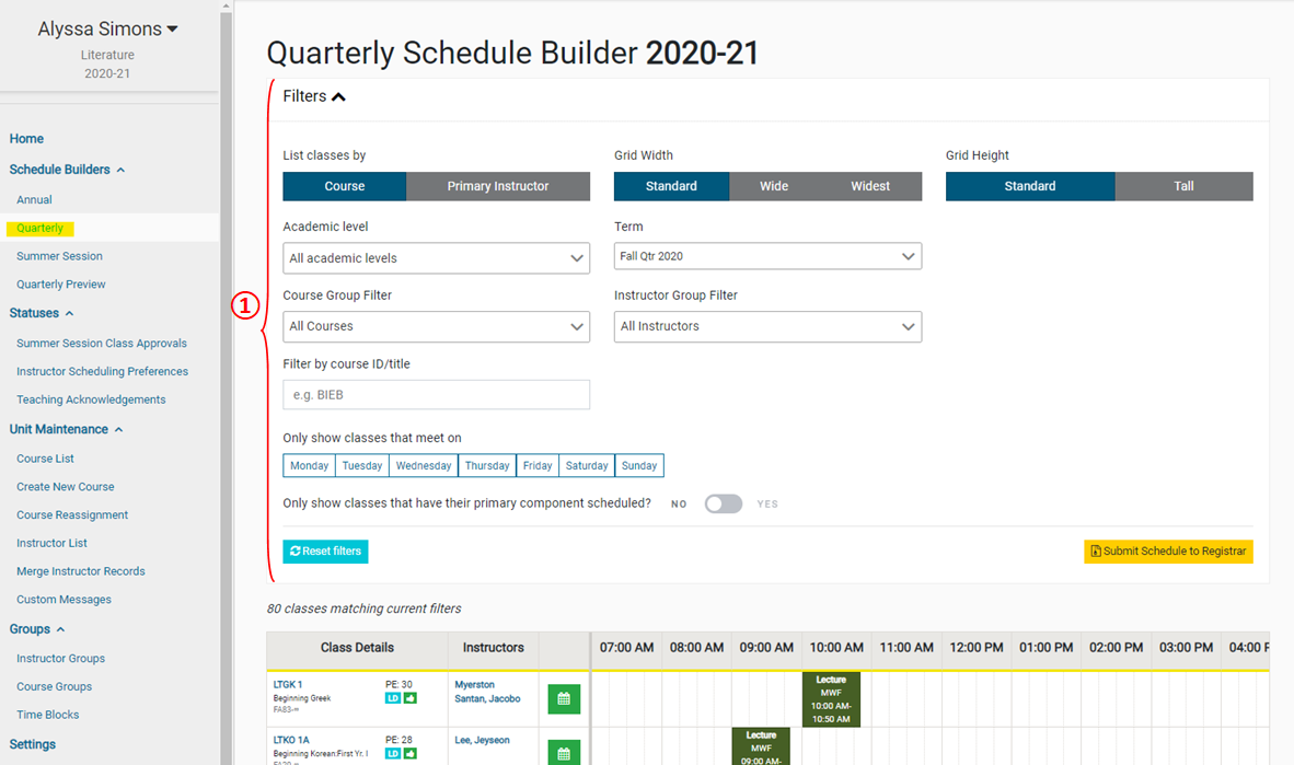 - The course grid will show all courses assigned to the quarter(s) selected in the filters